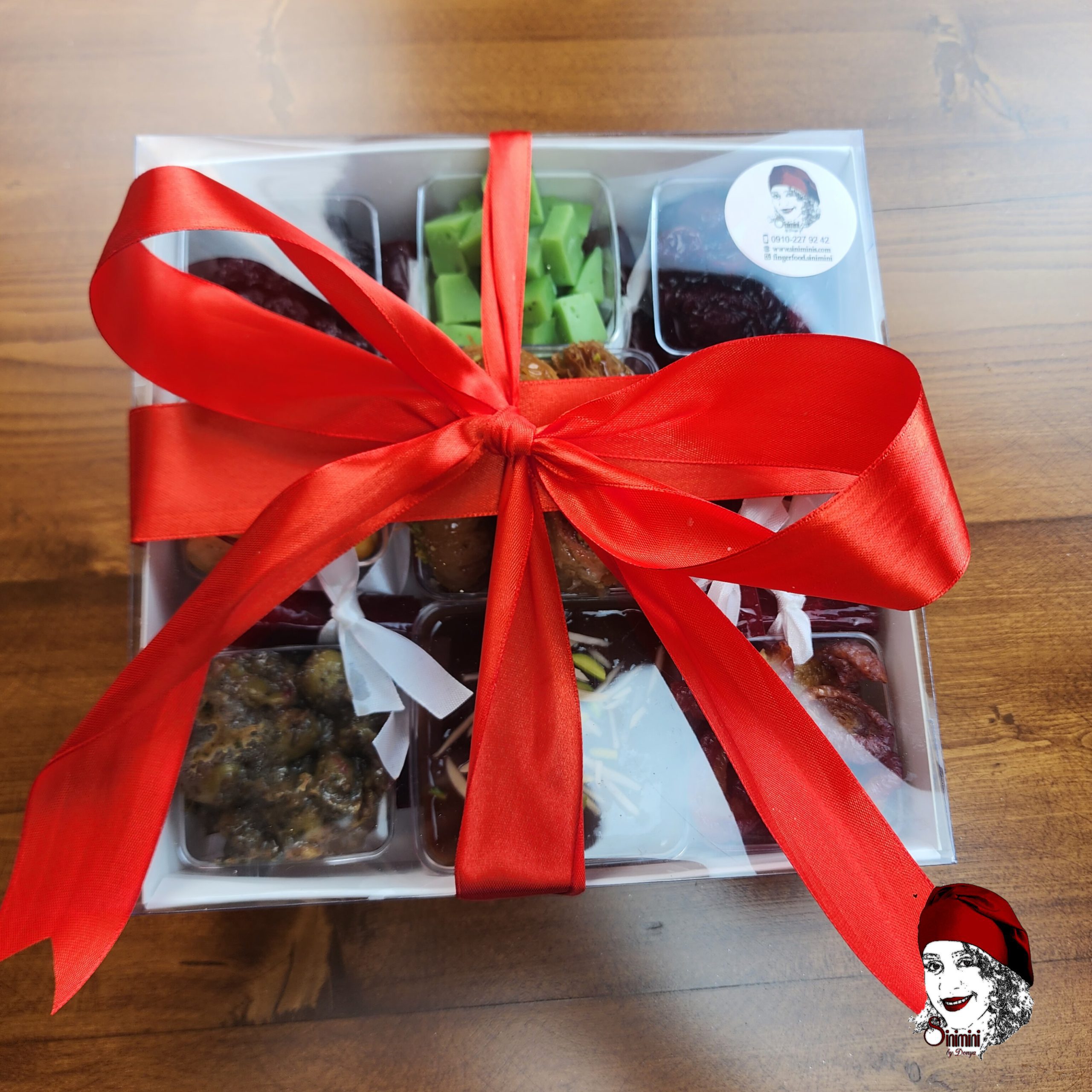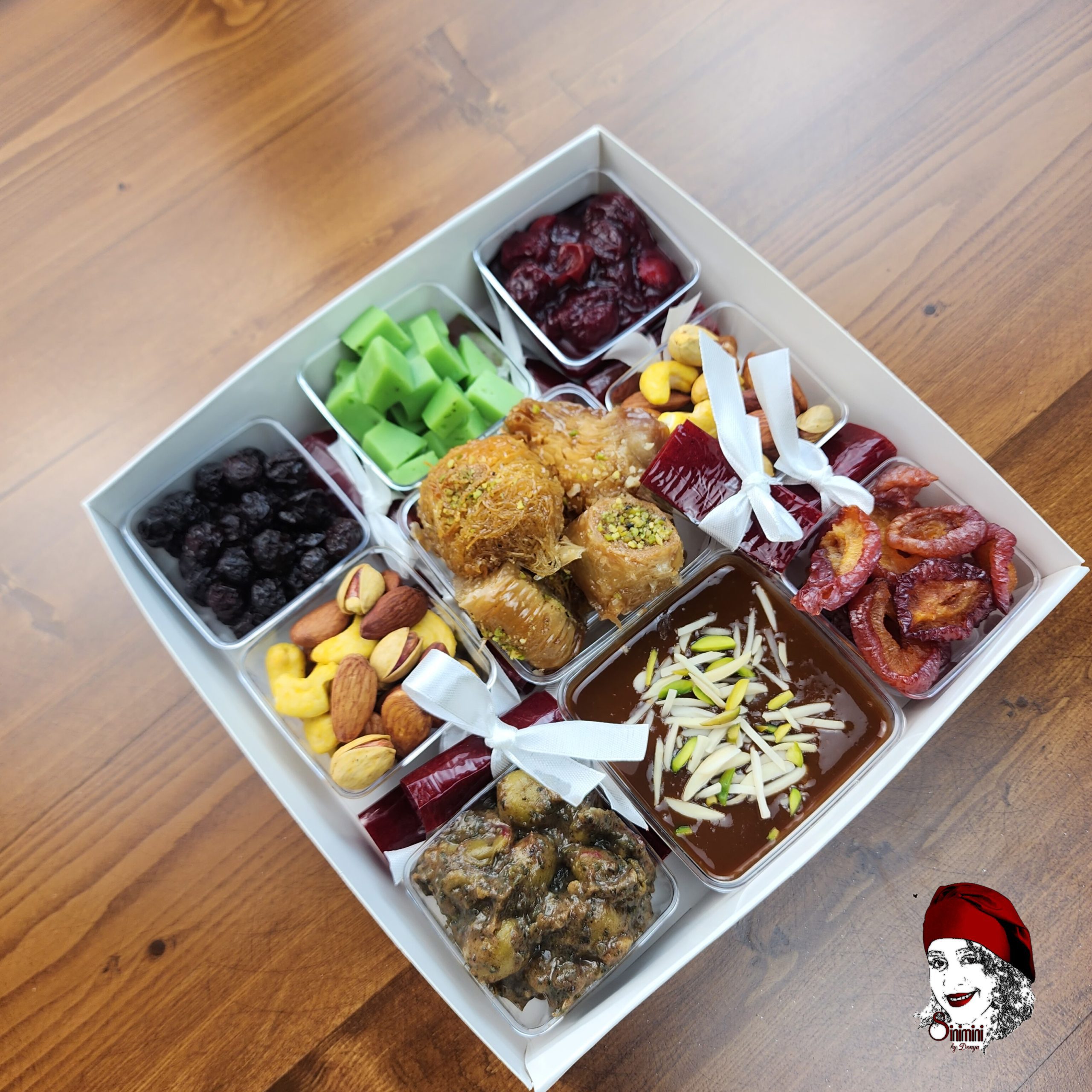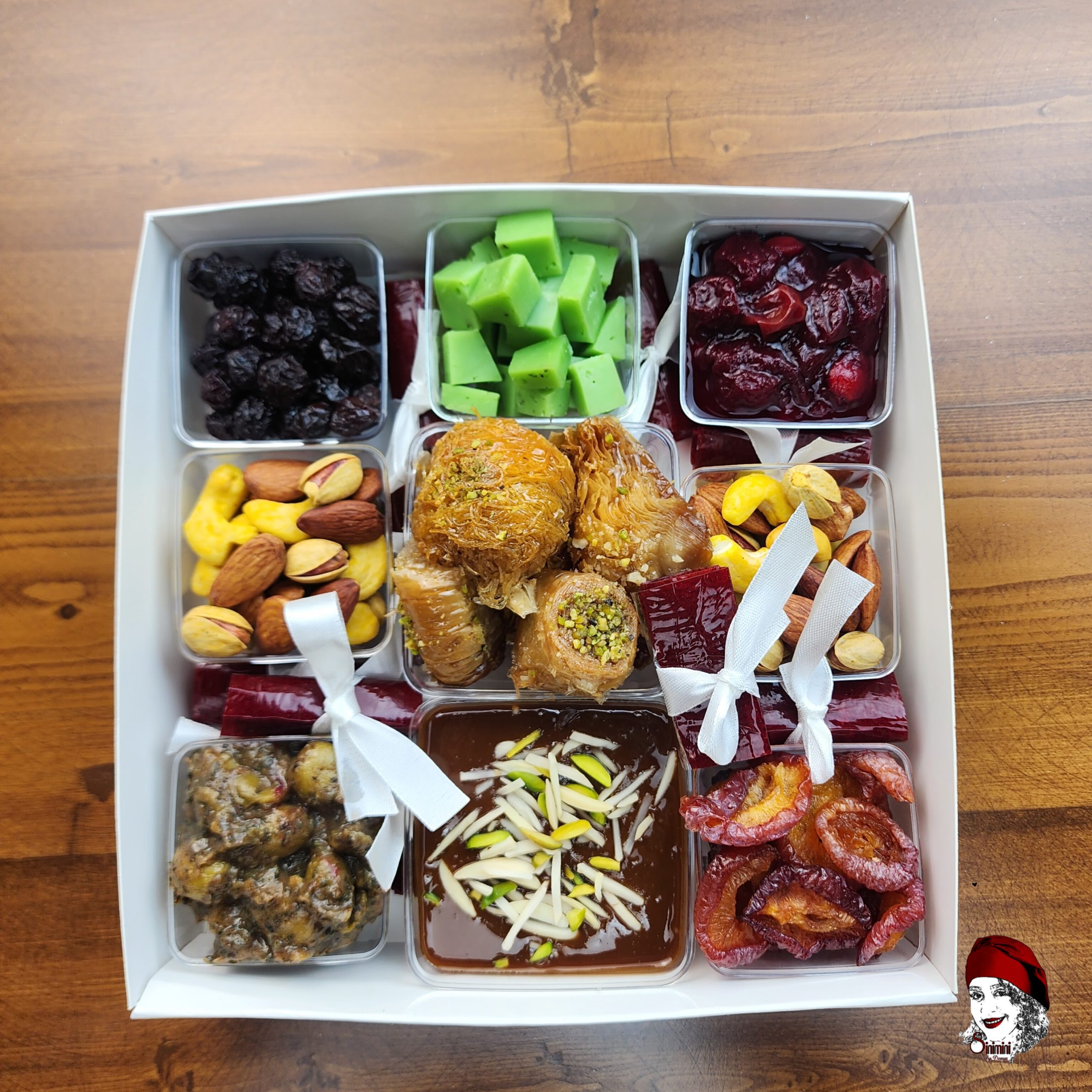 5 عدد باقلوا, آجیل مخلوط(پسته.بادام هندی.بادام درختی), آلبالو خشک, آلو خشک, پنیر پستو سبز, ترشی آلو جنگلی, زیتون پرورده, سمنو, لواشک رول شده |