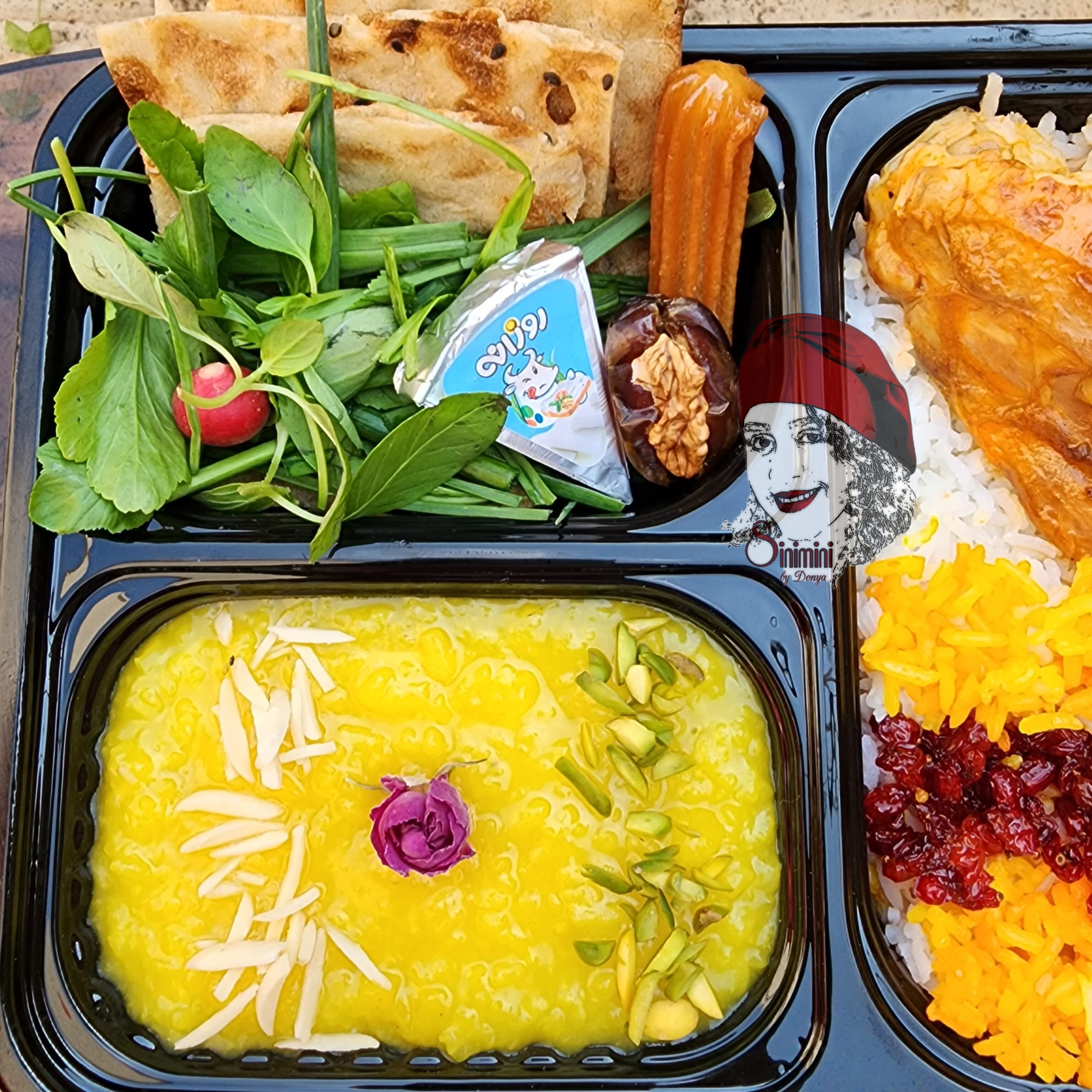 بامیه, خرما با مغز گردو, زرشک پلو و مرغ, شله زرد, نان و پنیر و سبزی